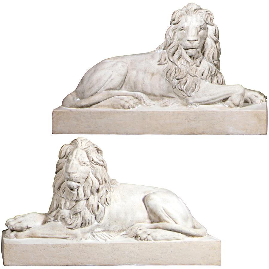 Adopt the noble British tradition of placing lion sentinels outside castle or manor gates to show wealth and position. Our symbolic, stylish, classic cats announce themselves as majestically poised protectors who make a royal statement as they recline regally outside your front entryway. Unparalleled as classic animal art, our enviable, fiberglass-reinforced, quality designer resin replica statues feature a faux stone finish to replicate the ancient originals. They are finely finished exclusively for Design Toscano and showcase aristocratic details from imperial mane to muscular haunches. A pair of lions flanking an entryway, porch or garden walk elevates any destination to the next level of distinction in home decor. Head Right: 48½"Wx16"Dx29"H. 55 lbs. Head Left: 48½"Wx16"Dx29½"H. 51 lbs.