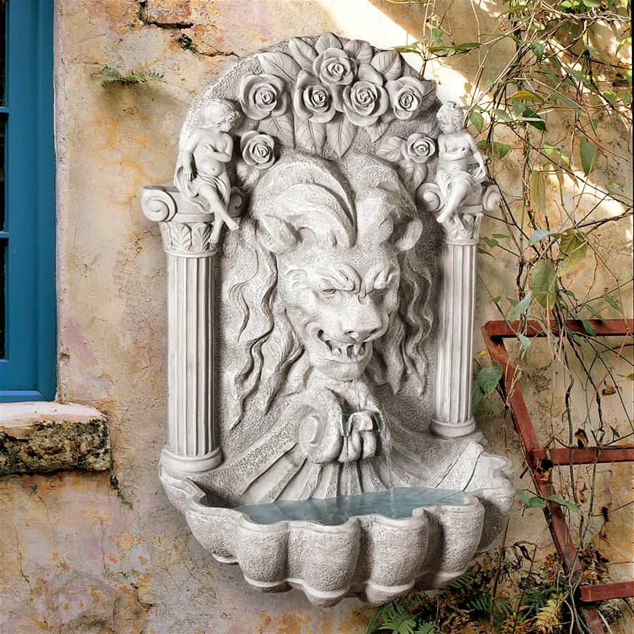 Make a design statement with this magnificent sculptural work, the largest wall fountain we've ever sold! Sparkling water flows in a soothing pattern of water music reminiscent of a small Italian village. At over a yard tall, our Toscano exclusive features an incredibly detailed lion ringed with roses, cherubs and a shell urn. Cast in quality designer resin to capture each detail, it is finished in faux stone for Old World style. Boasts an integrated indoor/outdoor, UL-listed pump. Ships in 3 pcs. 25"Wx13"Dx37"H. 40 lbs.