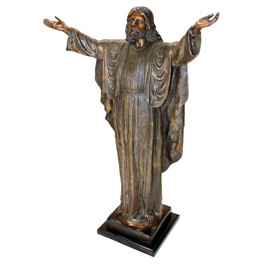 With arms and heart wide open for all who believe, this reverential figure of Jesus Christ the Lord will serve as an instant destination for prayer and reflection wherever he is positioned. Our impressive, 360-degree, almost-three-foot-tall bronze religious statue sits atop a solid marble base and is expertly finished with a hand-applied, classic sepia bronze patina to bring out the amazing detail. Cast and crafted one piece at a time in the traditional lost wax method, which highlights the detail of the sculpt and guarantees lasting beauty. Sure to be a garden focal point, this Design Toscano, heirloom-quality bronze spiritual statue conveys that you take the exterior of your home as seriously as the interior. 21½"Wx8"Dx31"H. 26 lbs.