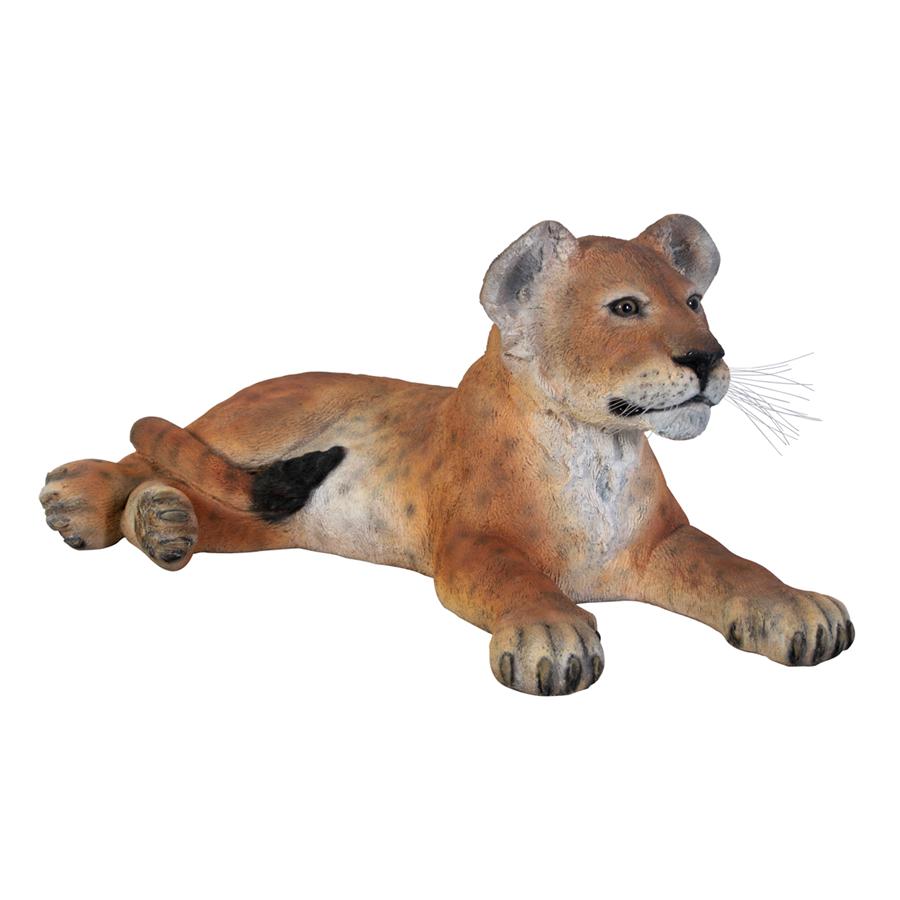 Our adorable lion cub adds an exotic touch to your home or garden! With characteristically fierce beauty, this lion statue is amazingly detailed, cast in quality designer resin, and hand-painted to capture every cat nuance. This large-scale, display-quality lion cub sculpture transforms any home, garden, restaurant or hotel into something truly magnificent! Lying Down: 32"Wx17"Dx15"H. 7 lbs.