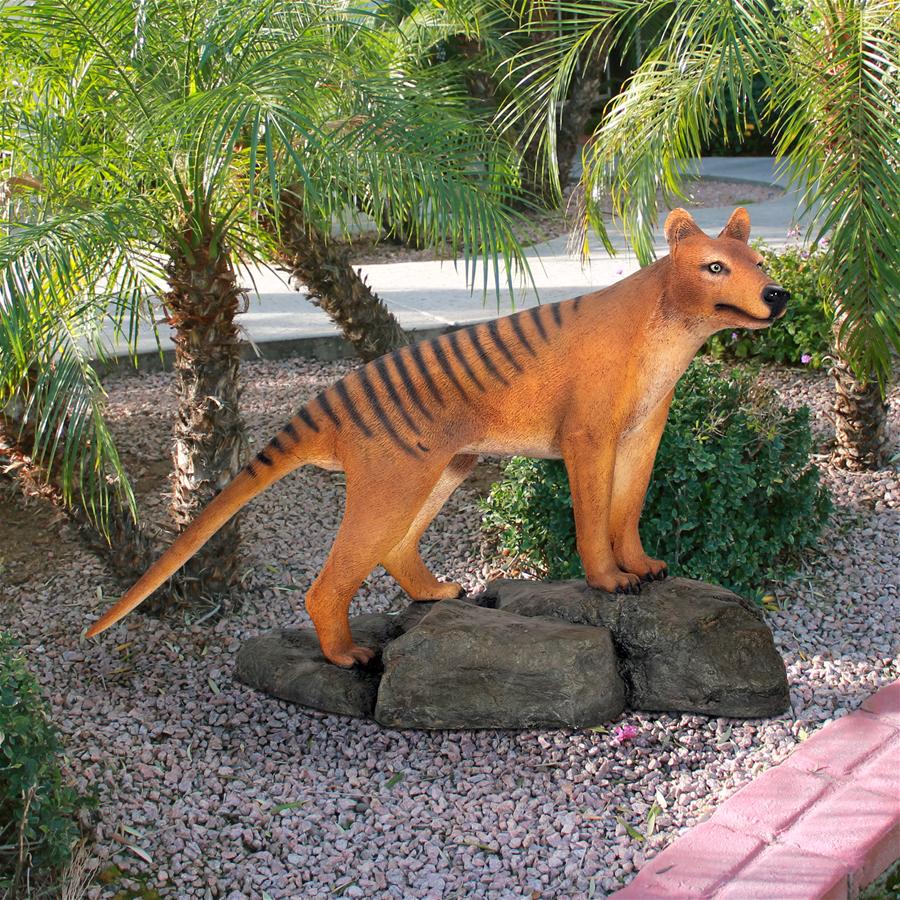 Imagine looking out at your garden to discover our fierce boldly colored, wild Tasmanian Tiger sculpture on the prowl! The last wild Tasmanian tiger was hunted to extinction between 1910 to 1920, and the last captive one died in 1936 at a Tasmanian zoo. While the researchers feel chances are slim that the Tasmanian tiger still roams Australia, they can't help but to look for evidence of this mysterious animal. Our Design Toscano fiercely beautiful tiger statue is amazingly detailed, cast in quality designer fiberglass resin, and hand-painted with characteristic thick black tiger stripes that capture every sculptural nuance. Our Design Toscano mysterious Tasmanian Tiger large-scale, display-quality animal sculpture transforms any home, garden, restaurant or hotel into something truly magnificent!