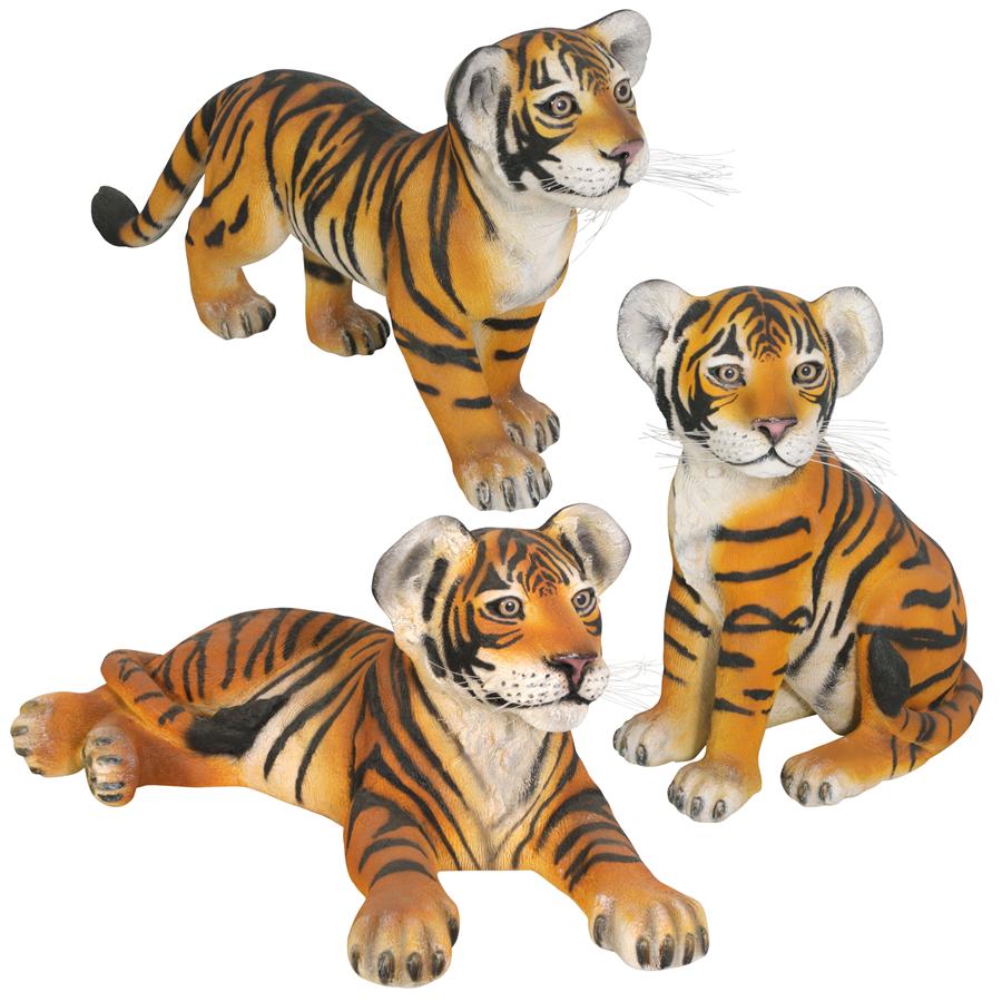 These playful tiger cubs add an exotic touch to any home or garden! With characteristically fierce beauty, these baby tigers are amazingly detailed, cast in quality designer resin, and hand-painted with thick black stripes that capture every nuance. These large-scale, display-quality animal sculptures transform any home, garden, restaurant or hotel into something truly magnificent! Our playful Bengal Tiger Cubs are perfectly paired with its mother, Bengal Tiger Statue, NE-80120. Set of Three: Lying Down: 32" Wx17" Dx 15" H. 12 lbs. Standing: 34" Wx9" Dx18½"H. 7 lbs. Sitting: 17" Wx11" Dx21½" H. 10 lbs.